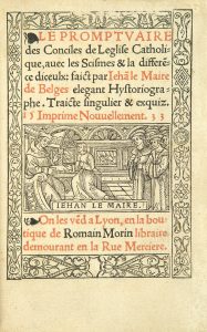 LEMAIRE DE BELGES (Jean). - Le Promptuaire des Conciles de Leglise Catholique, avec les Scismes & la difference diceulx. Lyon, Romain Morin, 1533. In-8, maroquin rouge estampé à froid, jeux de filets, bordure de rinceaux, petit fer aux angles,...
