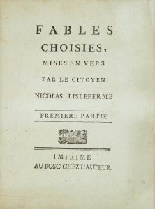 ►Seul exemplaire connu, semble-t-il, tiré sur un papier vergé bleuté, de ce recueil de fables composé par le citoyen Lisleferme (1737-1821), poète et jurisconsulte bordelais qui fit partie de la franc-maçonnerie locale et des cercles éclairés de la ville.