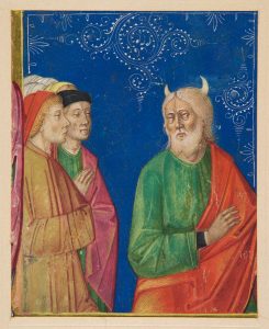 MANUSCRIT. - Lettrine historiée. Italie, XVe siècle (90 x 73 mm). Décoration d'une lettrine d'un antiphonaire représentant Moïse parlant à son peuple (deux personnages visibles). Sur le bleu du ciel, motifs décoratifs blancs à la plume....