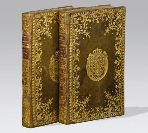 aux petits fers avec fer à l'aigle couronné aux angles, armoiries dorées au centre, dos lisse orné avec fer à l'aigle couronné répété, pièces de titre rouges, roulette intérieure, doublure de papier doré orné d'un décor végétal bleu ciel, tranches dorées (Reliure de l'époque).