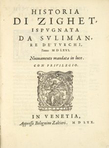 ULLOA (Alfonso de). - Historia di Zighet, ispugnata da Suliman re de' Turchi, l'anno 1566. Venise, Bolognino Zaltieri, 1570. In-4, broché, couverture postérieure de papier dominoté à motif floral. ►Très rare édition vénitienne du fameux...