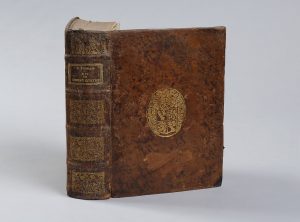 ancienne basane havane mouchetée, aux armes de Thomas II de Morant, baron du Mesnil-Garnier, et de sa femme Jeanne Cauchon de Treslon, fondateur à perpétuité, en 1620, des prix à distribuer au collège des jésuites du Mont à Caen.