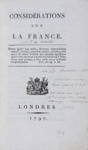 *** [MAISTRE (Joseph de)]. Considérations sur la France. Londres, 1797, 246 p. (E.O. ?). [Relié à la suite], CONSTANT (Benjamin), Réflexions sur les Constitutions, la distribution des pouvoirs et des garanties dans une monarchie...