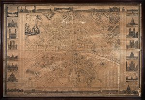 Première édition de ce rare et superbe plan mural de Paris, orné d'un cartouche de titre tenu par deux anges et décoré des allégories de la Renommée, de la Seine et de la ville de Paris. Le plan est encadré de vignettes représentant des places et des façades de monuments parisiens : Place Louis le Grand, Place Royale, Église de la Madeleine, Saint Sulpice, Hôtel de Ville, la Sorbonne, le Louvre, etc. Des tables indiquent les rues, les paroisses, collèges, hôpitaux, etc. Exemplaire bruni, frottements et petits manques. Quelques rousseurs.