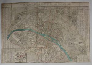 Superbe plan de Paris, avec table alphabétique des rues et carte du département de la Seine. Contours en coloris de l'époque. Exemplaire replié, déchirure à une pliure, déchirure dans le coin supérieur gauche. Boutier, 326B.