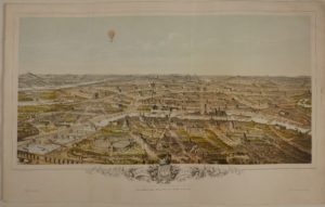 - BRAUN & HOGENBERG. Lutetia, vulgari nomine Paris, urbis Galliæ maxima. [Cologne, 1572]. 340 x 480 mm, sous passe-partout. Plan en élévation figurant Paris en 1530, issu de la première partie du Civitates Orbis Terrarum. Dans le coin supérieur gauche, un cartouche, orné en tête des armes de Paris, et encadré de guirlandes et d'enroulements dans le style de l'époque de Henri II, contient une inscription de huit lignes servant de titre. Dans le coin inférieur gauche, un gentilhomme salue deux dames. Les costumes sont contemporains de Charles IX. En bas à droite sont gravés quatorze vers français. Texte latin au verso. Exemplaire fortement bruni, en coloris modernes, petit manque dans la partie droite. Boutier, 15. - Plan de la ville citté et université et fauxbourgs de Paris. Paris, I. Lagniet, [circa 1660]. Superbe plan orné des armes royales et de la ville, ainsi que d’une chronologie des rois de France de Pharamond jusqu’à Louis XIV, composée de leur portrait gravé. Exemplaire quadrillé à la sanguine, marges coupées, remonté. Monté avec une gravure du duché de Normandie par Jollain (Normandia Ducatus). - GUESNU (H.). Aspect de Paris. Vue générale prise du bois de Boulogne au bois de Vincennes. Paris, Guesnu, [circa 1850]. Dessiné et lithographié en couleurs par Guesnu. Traces de plis, petites déchirures marginales.