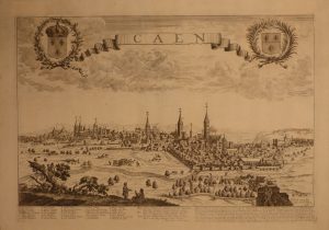 Superbe et rare vue de la ville de Caen, ornée des armoiries royales (maculées pendant la Révolution) et animée au premier plan de personnages. Avec renvois de A à Z et de 1 à 12, et description de dix lignes en français et latin. Pli central. Exemplaire lavé.