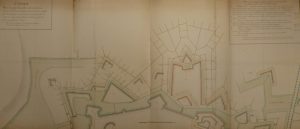 [SAINT-OMER – MANUSCRIT]. St. Omer. Plan du projet des galleries de contremines dont il conviendroit envelopper le front de la Corne appellée fort des Cravattes, avec les parties droittes et gauche de cette Corne depuis l'innondation du Nard,...