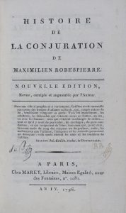 On joint, du même : Histoire de la conjuration avec Maximilien Robespierre, Nouvelle édition, Paris, Marais, an IV (1796). [Relié à la suite] : Tableau de la Convention nationale contenant la liste des députés… P., 1793 ; 2 parties en un vol. in-8, veau havane marbré de l'époque, dos à nerfs, pièce de titre maroquin havane (trav., de vers affectant qq. lettres en milieu de vol.). Ex-libris bibliothèque de Clays-Palys.
