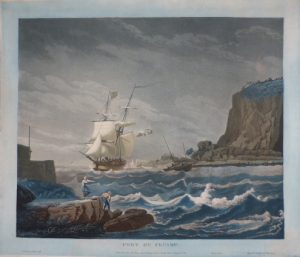 - NOËL. Port de Fécamp. Paris, Bassan, [circa 1810]. Lithographie en couleurs sur fond bleu gravée par Aubertin. - Le port et la ville de Cherbourg. [circa 1860]. Lithographie gravée en couleurs par Deroy. Bel ensemble.
