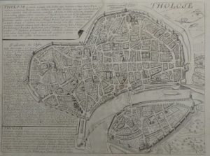 Rare plan cavalier de Toulouse, accompagné d’un texte de commentaire en latin et en français et d'une table de renvois des 113 lieux principaux de la ville. La carte est très détaillée et présente les rues, les remparts et les bâtiments. De petits frottements et taches.