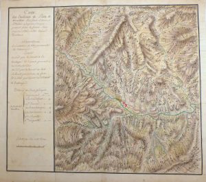 [PRATS de MOLLO – MANUSCRIT]. Carte des environs de Prats de Mouillou pour servir à déterminer l'étendüe de la promenade que pourront faire les soldats sans craindre d'être arrêtés comme déserteurs. [circa 1760]. 495 x 575 mm.