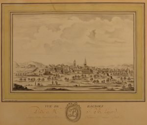 [BAGNOLS-sur-CÈZE – DESSIN]. GONET. Vue de Bagnols. 1782. 160 x 250 mm, monté sur papier (260 x 320 mm).