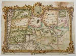 Très beau plan manuscrit, encre noire et aquarelle, d'une petite partie de la forêt d'Enghien, à quelques kilomètres à l'ouest de Saint-Martin-d'Ablois, dans la Marne. Y sont figurés les étangs de la Place aux Puits (qui existent toujours), et ceux du Travail et des Batis (aujourd'hui disparus), le plan des bâtiments du lieu-dit La Place aux Puits, les chemins, les parties cultivées et les parties boisées. Les terres appartenant à M. Marquis sont entourées d'un trait rouge avec la mention de leur surface. Le titre et le plan sont inscrits dans un encadrement imitant les cadres en bois doré de l'époque. Mouillure importante dans la marge supérieure sans atteinte importante au dessin, trous d'épingle dans les marges.