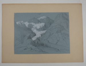[MONT BLANC]. Ensemble douze dessins originaux à la mine de plomb, certains rehaussés de craie blanche, trois sur papier bleu, tous contrecollés sur papier fort. [XIXe siècle]. Tailles diverses : 6 de 200 x 270 mm, et 6 plus petits.