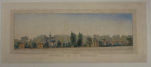 Superbe dessin montrant le Château de la Gérardière et ses dépendances pour un projet architectural. Il se situe dans la commune du Cellier, près de Nantes. Exécuté à la plume et aquarellé de plusieurs couleurs, le dessin est signé et daté à l'encre 8 Xe 1874, F. Bourgouin, Architecte. Le domaine de la Gérardière fut autrefois la propriété de Maximilien Gabriel Siffait et plus tard de son fils Oswald, les constructeurs des Folies Siffait, un immense labyrinthe de terrasses et d'escaliers présenté sous forme de ruines artificielles, édifié entre 1816 et 1830.