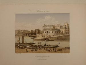 La France de nos jours. Nantes. Quai de la Fosse. 200 x 280 mm. – La France de nos jours. La poissonnerie à Nantes. 200 x 280 mm. – Nantes. Vue du château et du pont de la Rotonde. 200 x 285 mm. Salissures marginales. - Chambord. Château royal de Chambord. 195 x 280 mm. Rousseurs. On joint : Ports et mer d’Europe. France. Vue de Nantes. 1863. 310 x 480 mm. Rousseurs et mouillures. Soit un total de 5 lithographies.