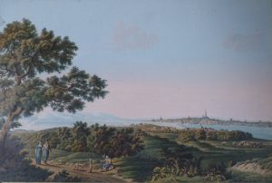 HÖGL. Vue de Vienne prise du coté du Château de Schönbrunn. [circa 1830]. 520 x 770 mm, important cadre mouluré en stuc doré, avec passe-partout noir portant le titre en lettres d'or, doublé de verre portant une frise dorée.