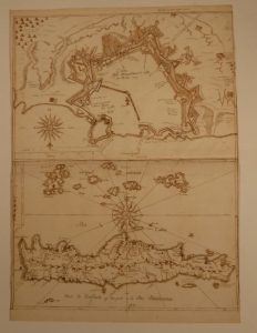 Beau plan manuscrit, à l'encre brune, montrant, dans la partie haute, le plan des fortifications de la ville de Candie (actuellement Héraklion, avec les attaques du siège de 1669), et dans la partie basse, une carte de l'île de Crète et des petites îles voisines. En 1669, après 22 ans de siège, la ville de Candie fut prise par les Ottomans, mettant fin à plus de quatre siècles de domination vénitienne. Les plans sont orientés. Belle condition.