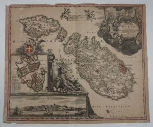 Superbe carte des îles de Malte et de Gozo, ornée de deux beaux cartouches, d'une vue de La Valette et d'un plan du port. Le cartouche de titre est décoré de chérubins et de chevaliers de l'Ordre de Saint-Jean ; le second cartouche, surmonté des armoiries des Grands Maîtres de l'Ordre de Saint-Jean, représente également un chevalier de Malte avec son équipement militaire. Exemplaire bruni, manques dans la marge supérieure affectant une partie du trait d'encadrement. Traces de pliures. Contours aquarellés à l'époque.