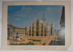 - LANDINI. Veduta del Duomo di Milano. Vue du Dôme de Milan. Milan, Torchiana, [circa 1830]. 305 x 410 mm. Belle gravure à l'aquatinte animée de nombreux personnages. Mouillures. - MALINVERNO. Il Duomo di Milano. [circa 1890]. Belle chromolithographie réalisée d'après une photographie. Description en italien. Petites mouillures et déchirures marginales, traces de cassures dues à l'épaisseur du papier.