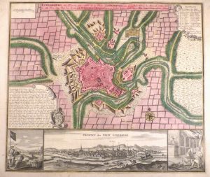 Superbe et rare planche dédiée à la ville de Luxembourg, avec un plan et un panorama de la ville. Exemplaire doublé de papier kraft, sinon belle condition, pleins coloris de l'époque, très frais. On joint : - MOLL (Herman). Les Provinces des Pays-Bas Catholiques ou a Most exact Map of Flanders or ye Austrian Netherlands &c. Londres, [circa 1730]. 610 x 1010 mm, entoilée. Belle et très grande carte ornée d'un cartouche de titre avec armoiries, d'un plan de fortifications, d'une carte des chemins de Paris vers les villes du Nord et d'une carte de la partie méridionale du Luxembourg. Contours aquarellés à l'époque. - DE L'ISLE (Guillaume). Carte des provinces Unies des Pays Bas. Amsterdam, Jean Covens et Mortier, [circa 1720]. 470 x 620 mm. Jolie carte avec contours aquarellés à l'époque, ornée d'un beau cartouche. Soit un total de 3 cartes.