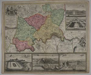 Très belle estampe figurant un plan de Londres avec une carte des environs, et cinq grandes vignettes contenant des vues des châteaux et palais de Windsor, Hampton Court, Kensington, Greenwich, et des hôpitaux royaux de Chelsea et Greenwich. Le cartouche de titre est orné des armoiries royales, tandis que la table des légendes est animée d'un personnage. Coloris de l'époque. Petites rousseurs marginales, courte déchirure au bas de la pliure centrale.