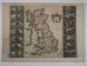 - BLAEU (Willem). Britannia prout divisa suit temporibus Anglo-Saxonum, præsertim durante illorum Heptarchia. [1658-1662]. 415 x 525 mm. L'une des plus belles carte des Îles Britanniques au XVIIe siècle, ornée de sept portraits de rois saxons avec leurs armoiries, et de sept vignettes contenant des scènes de conversion de souverains saxons au christianisme. L'Angleterre, l'Ecosse et le Pays de Galles sont divisés en royaumes saxons, chacun décoré de son blason. Rare édition espagnole avec texte espagnol au dos. Exemplaire en pleins coloris de l'époque. Marges coupées et renouvelées, déchirures restaurées, exemplaire empoussiéré. - MERCATOR (Gerhard). Irlandiæ regnum. [circa 1630]. 330 x 415 mm. Belle carte de l'Irlande en coloris de l'époque. Texte français au verso. Marge gauche doublée, mouillures marginales, petit manque à la pliure centrale.