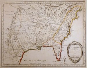 Belle carte figurant les États-Unis depuis le lac Supérieur au nord jusqu'à Santa Fe au Nouveau-Mexique à l'ouest, avec la Floride. Les tribus indiennes sont nommées, ainsi que les forts militaires. L'endroit où fut tué Cavelier de La Salle, explorateur et fondateur de la Louisiane, est également indiqué, près de la ville actuelle de Navasota au Texas. Ornée d'un cartouche de titre avec dédicace à Antoine-Louis Rouillé, secrétaire d'Etat à la Marine. Contours aquarellés à l'époque. Manque au niveau de la Baie de la Chandeleur près de la Nouvelle-Orléans, quelques discrètes coupures réparées, marge droite très courte.