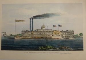 Superbe lithographie coloriée à la main, figurant le bateau à vapeur le Mayflower sur le Mississippi, d'après un dessin de Charles Parson. Bel exemplaire malgré une mouillure angulaire claire. Coloris très frais.