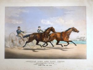 CURRIER (Nathaniel) & IVES (James Merritt). American girl and Lady Thorn in their great match for $ 2000 mile heats best 3 in 5 to wagons over the Fashion Course, L. I. May 10th 1869. New York, Currier & Ives, 1869. 440 x 690 mm.