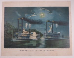 Belle chromolithographie figurant une course sur le Mississippi, par une nuit de pleine lune, entre les deux bateaux à vapeur le Lincoln et le Davies. Considérées comme de grands événements, les courses entre steamboats, véritables palais de bois flottants à plusieurs étages, entourés de galeries-promenade, furent fréquentes entre 1830 et 1870. L'estampe a été réalisée d'après un dessin du capitaine du Lincoln. Rousseurs, quelques manques restaurés dans les marges.