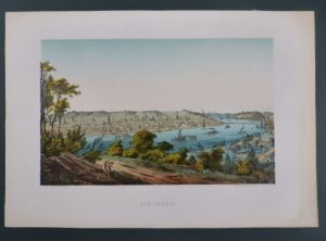 - WENTZEL (Jean Frédéric). Cincinnati. Paris, Veuve Humbert et Wentzel, [circa 1870]. 245 x 390 mm, sous passe-partout. Belle vue lithographiée en couleurs et gommée de Cincinnati et des rives de l'Ohio, animée de nombreux steamers et de personnages. Petites piqûres. - HABERMANN (Franz Xaver). Prospect von Boston gegen der Bucht am Hafen. Vue de Boston vers le Cale du Port. Augsbourg, [circa 1780]. 250 x 395 mm, monté sous passe-partout. Vue du port de Boston gravée par Habermann et finement aquarellée à l'époque. De la rare Collection des Prospects. Exemplaire lavé, présentant néanmoins des traces de poussière. Marges courtes.