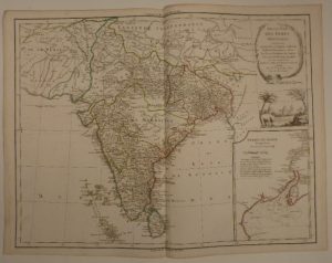- ROBERT DE VAUGONDY. Presqu'isle des Indes orientales comprenant l'Indostan ou Empire du Mogol. Paris, Lamarche, [circa 1790]. 480 x 630 mm. Jolie carte ornée d'une vue pittoresque avec un éléphant joueur et d'une carte de l'entrée du Gange et de son cours. Bel exemplaire, contours aquarellés à l'époque. - DE L'ISLE (Guillaume). Carte d'Asie. Amsterdam, Covens et Mortier, [circa 1740]. 495 x 615 mm. Jolie carte, avec contours aquarellés à l'époque. Quelques lettres du titre général dans la marge supérieure rognées.