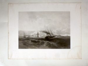 Belle vue lithographiée prise au large d'Alger, animée de nombreux navires voguant sur une mer déchaînée. Petites rousseurs marginales, grande mouillure dans le coin inférieur droit.