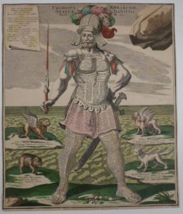 - Colossus Monarchic Statua Danielis Dan. II, 31. 575 x 490 mm. Superbe curiosité cartographique de Matthäus Seutter, figurant une statue sur laquelle est inscrite la chronologie des souverains des grands empires. Elle commence au casque avec les souverains assyriens et babyloniens, se poursuit sur le plastron et la jupe avec les perses, grecs et romains, et se termine par les souverains d'Orient et d'Occident sur les jambes gauche et droite. La figure de l'imposante statue, ici représentée avec un sceptre et une épée, est l'interprétation par le prophète Daniel du songe du Roi Nabuchodonosor II (Dan. 2:39-40). Quatre animaux fantastiques représentant les principaux empires et monarchies sont disposés de part et d'autre de la statue. Exemplaire en coloris de l'époque. Marges très courtes, petits trous d'épingles aux angles. - Icon synoptica sac. rom. Imp. Electorum, Ducum principum. 575 x 490 mm. Superbe gravure aquarellée à l'époque, représentant un électeur en robe, celle-ci entièrement recouverte des noms des souverains du Saint-Empire romain germanique, des princes, électeurs et ducs. On observe sur la gauche de nombreux blasons et sur la droite une couronne et un sceptre, ainsi qu'un bâton de maréchal posé sur un fauteuil. De petites rousseurs.