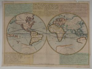 - CHÂTELAIN (Henri). Mappe-Monde pour connoitre les progres & les conquestes les plus Remarquables des Provinces-Unies, Ainsy que celles des Compagnies d'Orient et d'Occident. Et les Pais quelles possedent dans l'un et dans l'autre Hemisphere. [Amsterdam, circa 1720]. 335 x 455 mm. Belle mappemonde à deux hémisphères, destinée à montrer les colonies des Provinces-Unies. Exemplaire sans les décorations gravées qui ornent certains exemplaires. Exemplaire aquarellé. Deux petites déchirures marginales. - POIRSON. Mappe-monde divisée en deux hémisphères oriental et occidental. Paris, Jean, [circa 1820]. 465 x 715 mm. Mappemonde avec contours aquarellés à l'époque. Exemplaire froissé, quelques déchirures marginales.