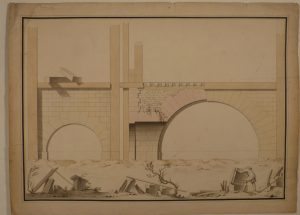 Ensemble de 9 dessins, encre noire, lavis et aquarelle, montrant différentes phases de la construction de ponts : tablier en bois, pont-levis, construction des piles, des voûtes... Quelques marges écornées, parfois avec de petites déchirures sans manque.
