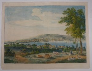 Beau paysage gravé au trait et finement aquarellé à l'époque. Petites taches blanches par endroits.