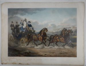 - Retour au château. Poste anglaise. 555 x 785 mm. Superbe lithographie en couleurs par Régnier, Bettanier et Morlon, représentant une diligence et ses quatre chevaux. Mouillures et salissures marginales, rousseurs. - Départ pour les eaux. Poste française. Superbe lithographie en couleurs par Soulange-Teissier, figurant une calèche et ses quatre chevaux. Quelques rousseurs, un petit trou dans la marge inférieure.