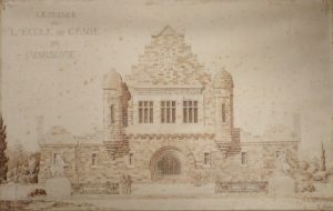 Beau dessin en élévation d'un projet de façade pour l'École Polytechnique de Varsovie, par l’architecte varsovien Tadeusz Zielinski, finement réalisé à la mine de plomb rehaussé à la plume. Vue très minutieuse et détaillée, animée de polytechniciens en uniforme. Manque au passe-partout, rousseurs.