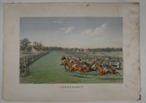 - DAVID (Gustave). Longchamp. Paris, Jourdan, Barbot & Cie, [circa 1880]. 445 x 690 mm. Superbe lithographie en couleurs représentant une course hippique sur l'hippodrome de Longchamp. Mouillures et rousseurs affectant principalement les marges, manques dans les coins inférieurs. - ADAM. Le Saut de la rivière. (Le Sport). Paris, Jouy, [circa 1860]. 370 x 545 mm. Lithographie en couleurs par Guillon. Mouillures marginales.