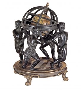 nom des signes du zodiac et soutenue par quatre personnages nus ou en toge, piètement de bronze doré avec boussole centrale.