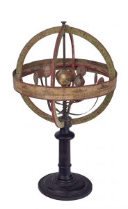 [DELAMARCHE (attribué à)]. Planétaire dit « copernicien » avec tellurium intégré. [début du XIXe siècle]. Hauteur : 460 mm. Diamètre du cercle de l'écliptique : 265 mm. Planétaire en bois peint ou doré, papier imprimé, laiton,...