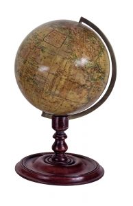MALBYS. Terrestrial globe compiled from the latest sources including all the recent geographical discoveries. Londres, Malby & Son, 1874. Hauteur : 250 mm. Diamètre du globe : 140 mm. Globe avec demi-cercle de laiton et piètement en bois tourné.