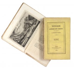 Édition originale, extrêmement rare et recherchée, de cet important voyage en Californie et à Hawaï. Elle est ornée de quatre vues lithographiées sur chine appliqué d'après les dessins de l'auteur, dont deux frontispices, représentant Monterey en Haute-Californie, la mission San Luis Rey de Francia, l’établissement russe de la Bodega sur la Côte de la Nouvelle-Albion et le port de la vallée d’Anaroura dans l’île de Waho [Oahu], qui est aujourd'hui le port de Honolulu. Le second volume contient de plus un tableau hors texte replié. « Among the rarest of the early voyages touching on California » (Hill). Il n'en subsisterait qu'une douzaine d'exemplaires complets, d'après Warren Howell. Capitaine de vaisseau dans la marine marchande, Auguste Duhaut-Cilly (1790-1849), au commandement du Héros, un voilier de 370 tonneaux, arrive à Yerba Buena par Mazatlán en 1827. Au cours des deux années suivantes, il voyagea dans toute la Haute-Californie, mais aussi à Valparaiso, aux îles Galapagos, Hawaï, Macao et Java. « No other traveller had visited so many of the Californian establishments, and his is the best contemporary account of the region. He also describes at some length his 1828 visit to the Hawaiian Islands, and includes a vocabulary of the Hawaiian language. The book is a primary source on Mexican California » (Parsons). « This commercial enterprise, although a financial failure, resulted in the first foreign account of Spanish California by a literate and observant French trader, who, while trying to sell his goods, visited most of the missions, presidios, and pueblos of Alta California, and wrote the best contemporary account of the region » (Hill). Exemplaire dans sa première condition, broché dans ses couvertures imprimées, avec toutes ses marges. Dos fendus en longueur avec légers manques, déchirure sans manque à un plat, quelques rousseurs éparses et infimes mouillures, chemise abîmée. Zamorano Eighty, n°31 – Sabin, n°21164 – Hill, n°499 – Howes, D547 – Forbes : Hawaiian, II, n°882 – Streeter, n°2472 – Parsons, n°238 – Howell : California, cat. 50, n°64.