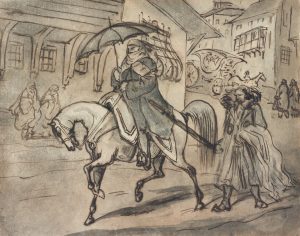 GUYS (Constantin). Cavalier à l'ombrelle. Dessin à la plume et encre brune rehaussé de lavis gris et bleu (17 x 22 cm), cadre de bois doré, verre, marie-louise.