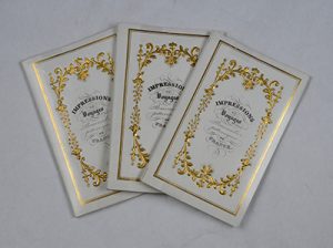 blanc orné d'un décor gaufré doré, gravure montée au centre (Reliure de l'éditeur).