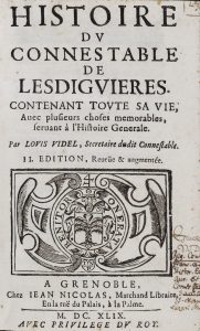 *** VIDEL (Louis). Histoire du connestable de Lesdiguières, contenant toute sa vie, avec plusieurs choses mémorables servant à l'histoire générale. 2e édition revue et augmentée. A Grenoble, chez Jean Nicolas, 1649, fort in-8, [16] f., 944 p....