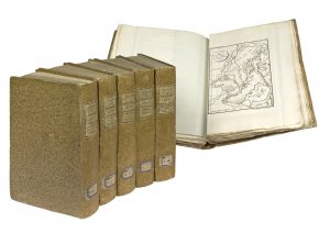 Édition originale. « Cette importante relation est peu commune » (Chadenat). Publié par Charles-Pierre Claret de Fleurieu, le récit de voyage d'Étienne Marchand fut imprimé simultanément en deux formats, en 3 volumes in-4 et en 5 volumes in-8, avec le même atlas de planches in-4. Celui-ci contient quinze cartes dépliantes et une planche gravée en taille-douce représentant des échasses de Whîtahô. Étienne Marchand (1755-1793) fut le second Français a effectuer un voyage autour du monde, après Bougainville. Le but de cette circumnavigation était avant tout commercial : il s'agissait d'acheter des pelleteries sur la côte Nord-Ouest de l'Amérique pour les vendre en Chine. Marchand quitta Marseille sur le navire Le Solide en décembre 1790, contourna la Terre de Feu, explora les îles Marquises, les îles Sandwich, se rendit en Chine puis retourna en Europe par l'Océan Indien. Claret de Fleurieu publia les observations de Marchand, la configuration de la côte Nord-Ouest américaine, son peuplement et les mœurs de ses indigènes. Il y ajouta une importante introduction historique, une partie d'histoire naturelle et deux vocabulaires indigènes. Cette relation de voyage contient également d'importantes observations sur la navigation dans le Pacifique. Exceptionnel exemplaire du tirage in-8, tel que paru, dans un état de conservation et de fraîcheur proche du neuf. La plupart des cahiers n'ont pas même été coupés. De la bibliothèque Jean-André Dezauche, éditeur de cartes géographiques au début du XIXe siècle, avec ex-libris. Hill, n°612 (éd. in-4) – Sabin, n°24751 (éd. in-8) – Chadenat, nos124 et 5095 (éd. in-4) – Brunet, III, 1399.